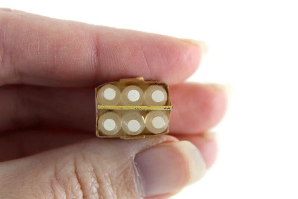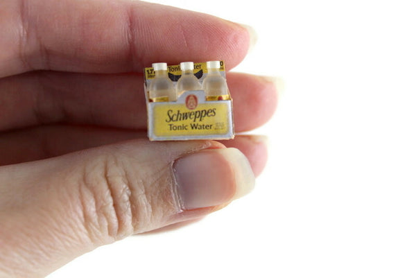 This vintage miniature artisan-made 1:12 scale piece has great details! The Schweppe's tonic water 6 pack carton is yellow, gray, red, and white with black printing, a handle in the center, and 6 removable clear bottles of tonic water, each with their own detailed paper label and white cap. Excellent vintage condition and perfect for your dollhouse kitchen, refrigerator, bar or drink cart!
