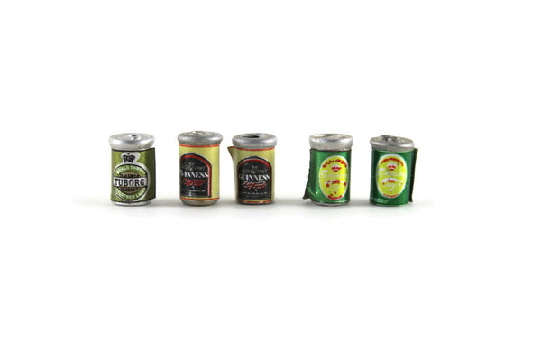 Vintage miniature 1:12 scale set includes 5 cans of beer made out of metal with paper labels and pop tab tops. The set has two cans of Guinness beer, two cans of Carlsberg, and one can of Tuborg. All are in excellent vintage condition and perfect for your dollhouse kitchen or bar!
