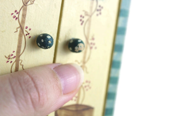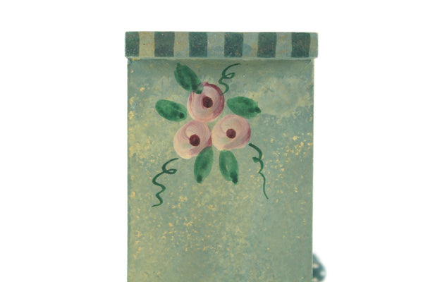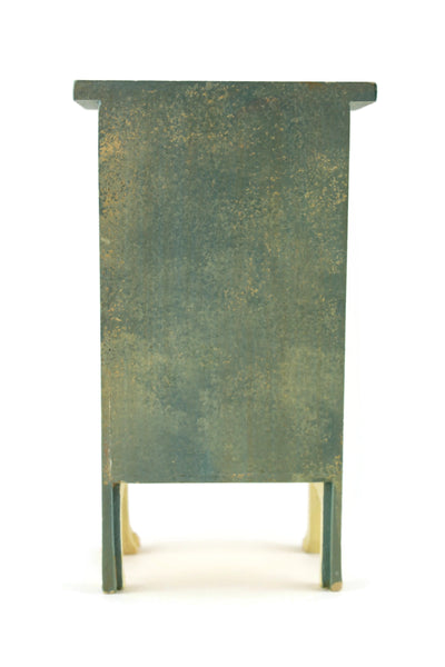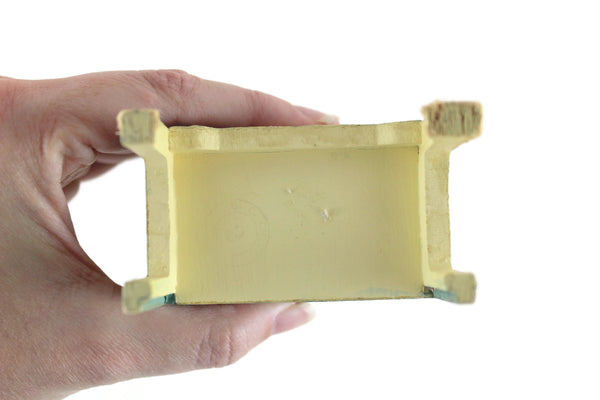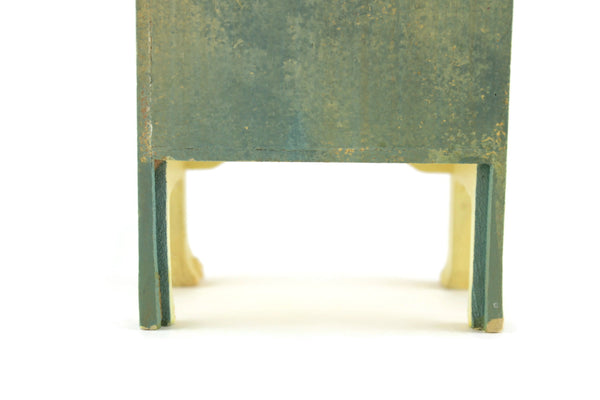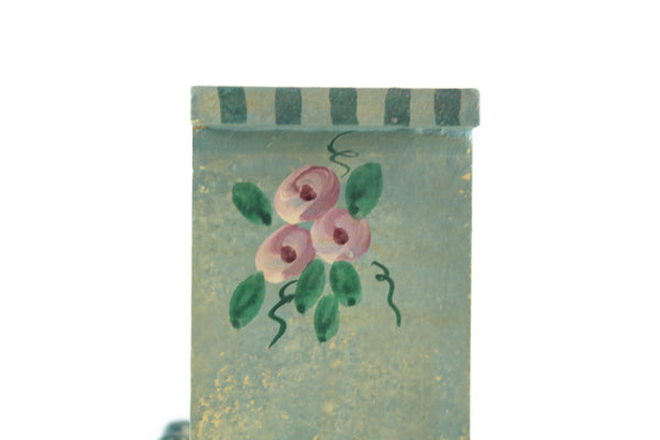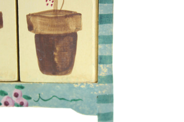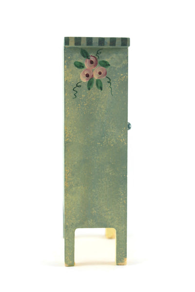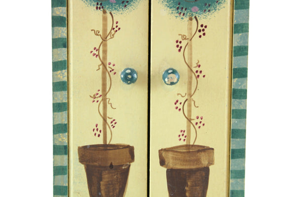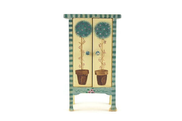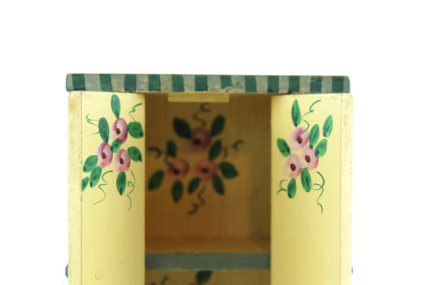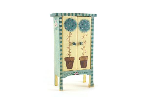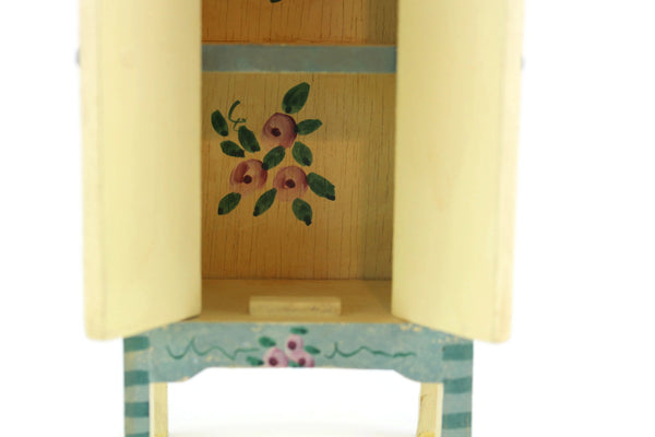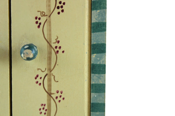 Vintage miniature 1:12 scale cabinet or cupboard is made of wood and painted pale yellow with light green paint sponged onto the top. The cabinet has stripes down the front in two shades of green, round green wooden knobs with tiny white polka dots, purple and green floral accents hand-painted on each side and at the bottom of the front. The two cabinet doors have hand-painted topiaries in green with brown pots and brown vines. So pretty! The cabinets open and the inside is painted the same shade of pale yellow and there are more floral accents inside along with a shelf. There are some minor signs of wear that are consistent with age and/or use and the two front legs are damaged in different ways (please see photos), but it's in overall great vintage condition and perfect for any room in your dollhouse!