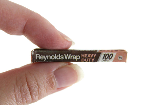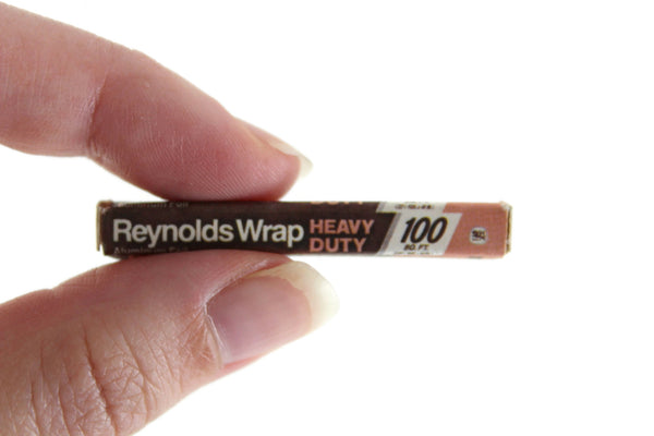 Cute vintage miniature Reynolds Wrap brand box of heavy duty aluminum foil is made out of cardstock in peach, white, and dark brown/black with writing on all sides of the box. Excellent vintage condition and perfect for your dollhouse kitchen, pantry or grocery bag, or use it in a grocery store or market diorama.
