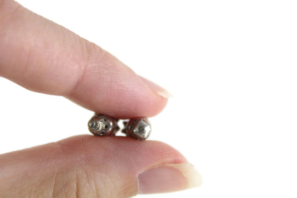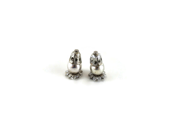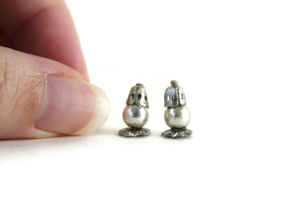 Vintage miniature 1:12 scale salt and pepper shaker set are silver with decorative carved pieces. Please note that both of them slightly lean to one side (see photos), but this is only noticeable from certain angles. They're in otherwise excellent vintage condition and perfect for your dollhouse kitchen or dining table!
