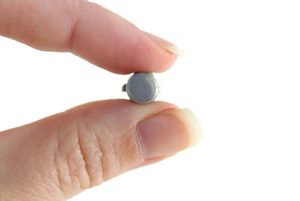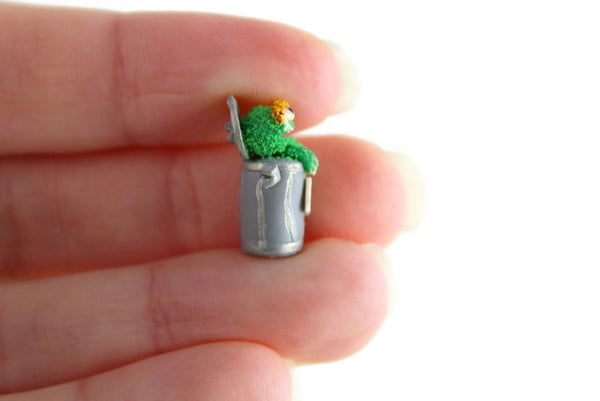 Adorable vintage artisan-made miniature 1:12 scale tiny figurine is of Oscar the Grouch, the grumpy Muppet from Jim Henson's 'Sesame Street' children's TV show! Oscar is peeking out of his silver trash can home with his hands hanging over the top and with a sign that reads 'Keep Out'. He has textured green fur, large eyes, and bushy brown eyebrows. There are some minor areas where some of the paint has come off that is consistent with age and/or use (please see photos), but he's in overall excellent vintage condition and perfect for your dollhouse nursery, playroom, or kid's bedroom!