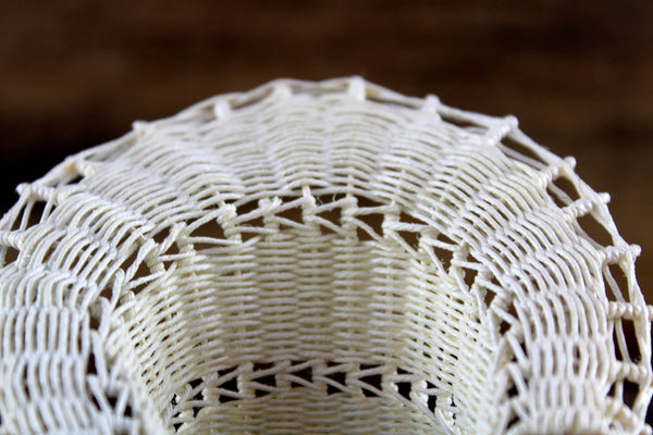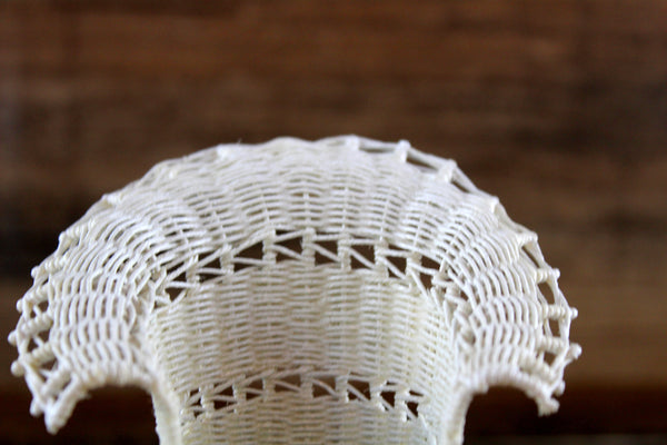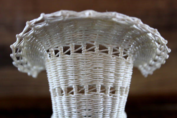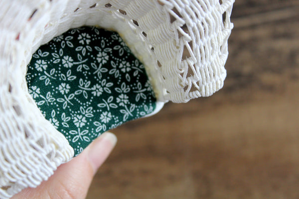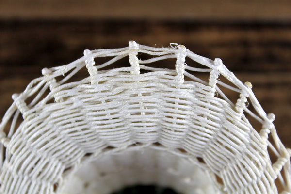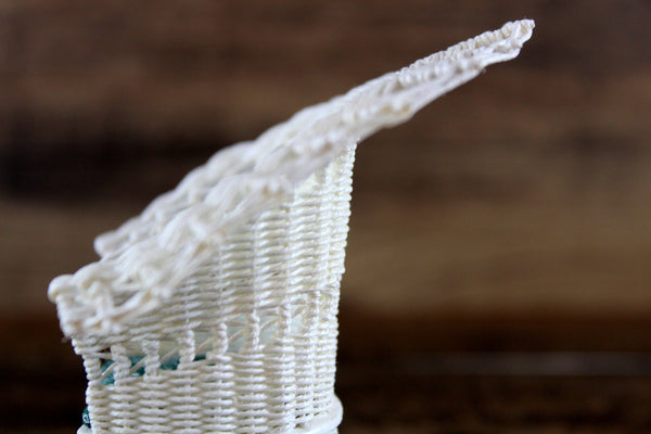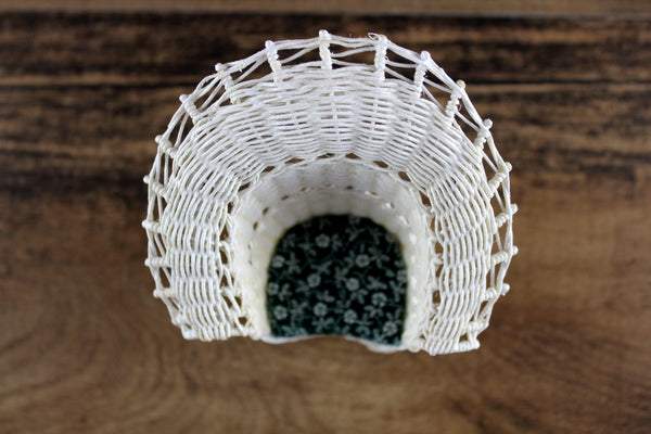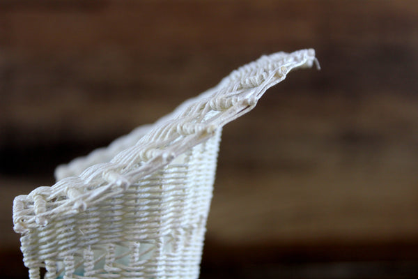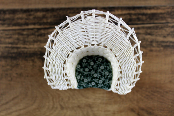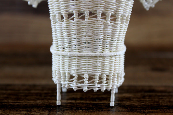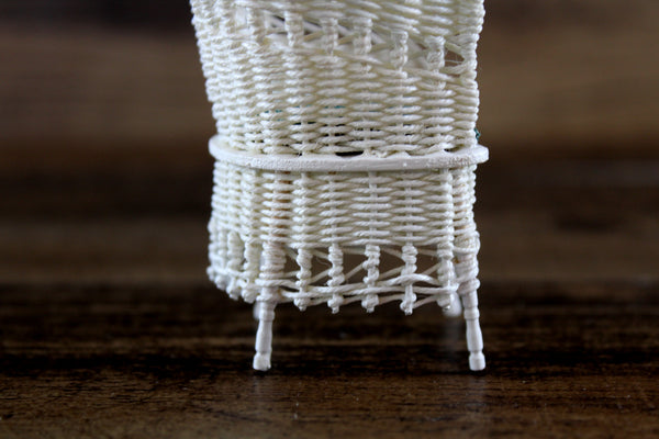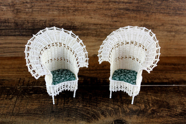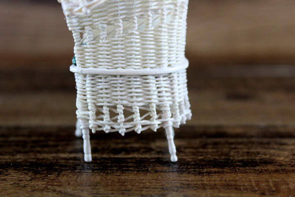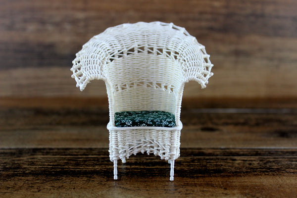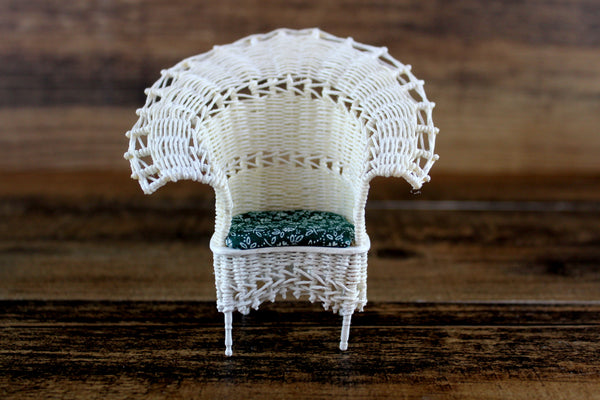 Eye-catching vintage miniature 1:12 scale artisan-made chair is white wicker with a wide, fan-shaped back and attached cushion in a dark green and white floral print. The bottom of the chair is signed by the artist and has the year "1991". Please note that we have 2 of these available - both are shown, but will be chosen at random at the time of purchase. Both are in excellent vintage condition and perfect for your dollhouse parlor, living room, porch, patio, sunroom, or garden!