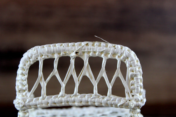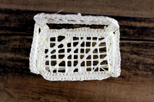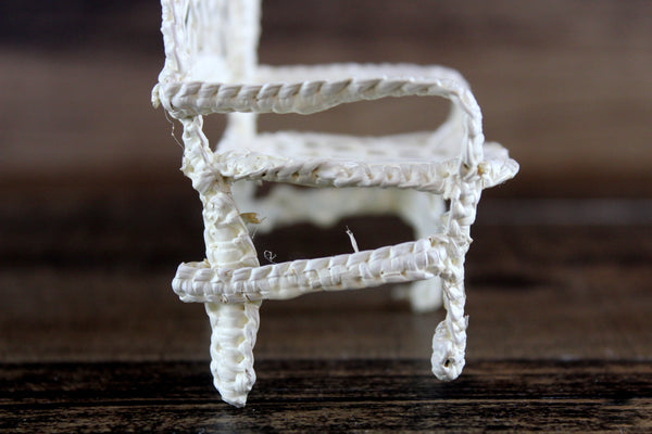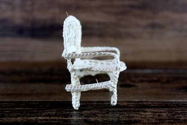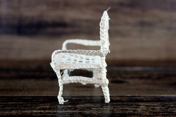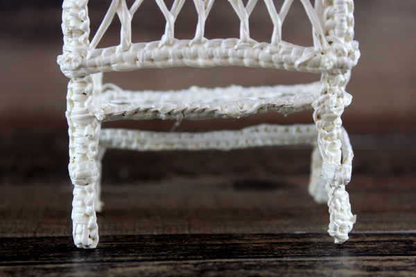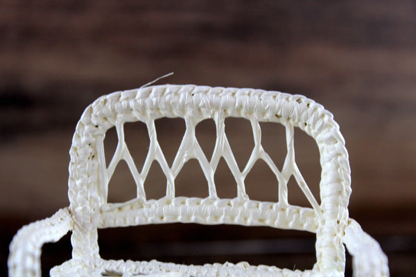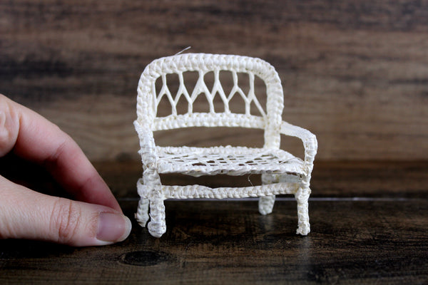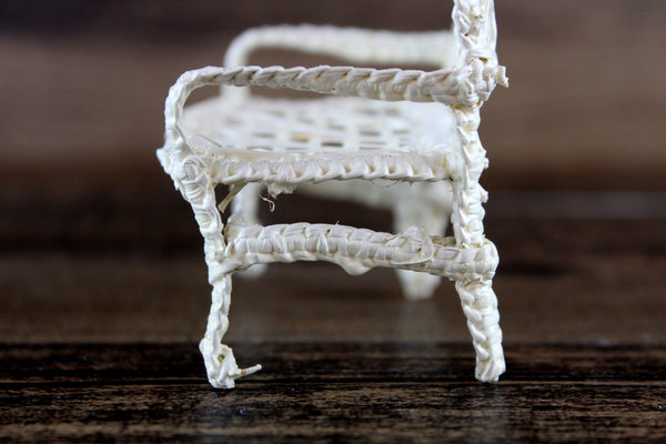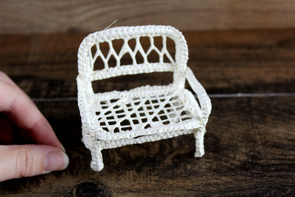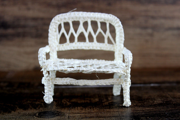 Vintage miniature 1:12 scale bench is made out of beige wicker and has a curved back. Great vintage condition and perfect for the porch, patio, or garden of a little one's first dollhouse!