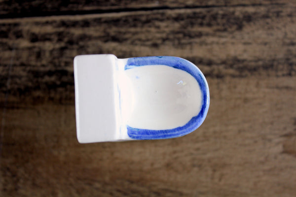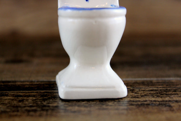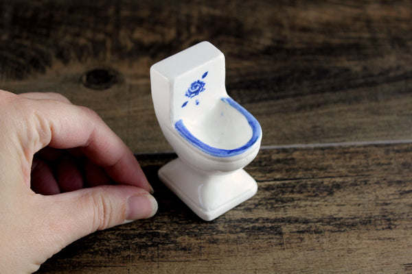Vintage miniature 1:12 scale toilet is made out of white porcelain and has a cobalt blue floral design on the back and a matching blue rim. The sticker on the bottom reads "Made in Japan". Excellent vintage condition and perfect for your dollhouse bathroom!