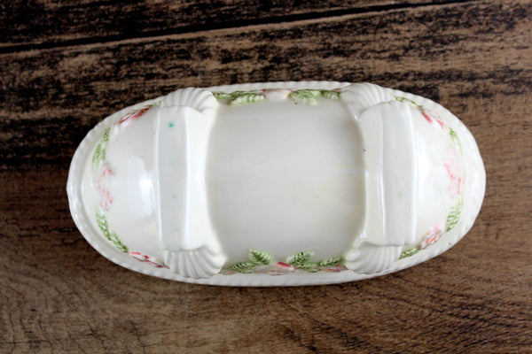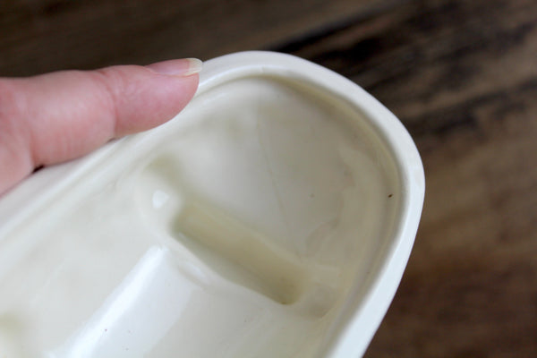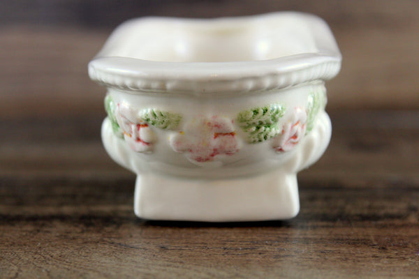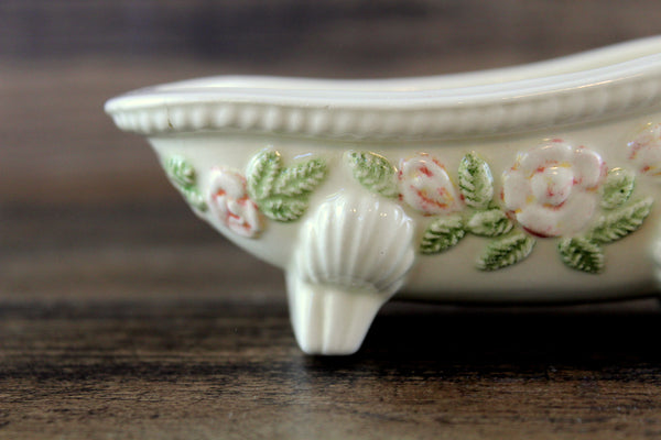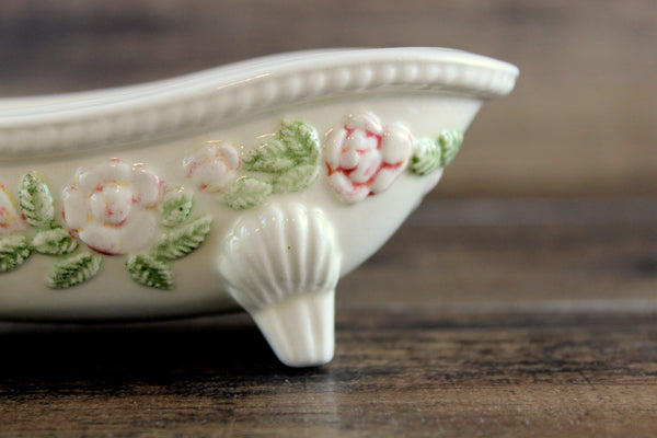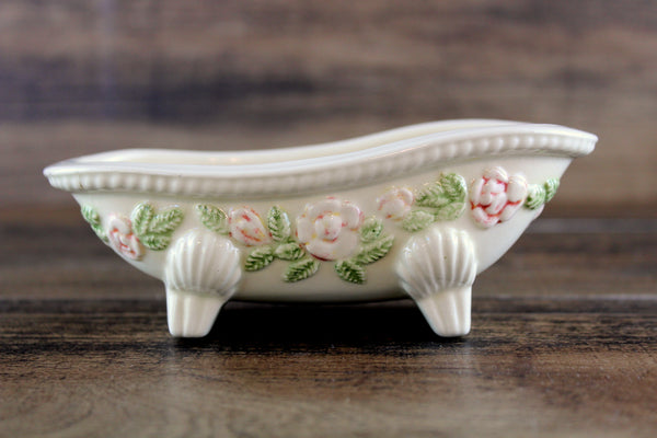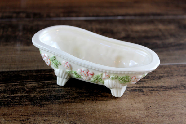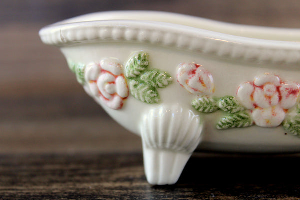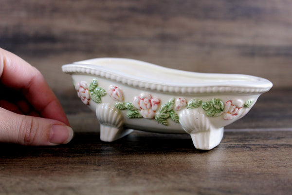 Vintage miniature 1:12 scale bathtub is made out of off-white porcelain and has textured pink flowers and green leaves around the entire outside. There are a few hairline marks or slight cracks that are due to the original manufacturer (please see photos), but it's in otherwise excellent vintage condition and perfect for your dollhouse bathroom!