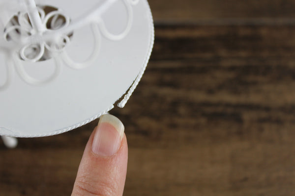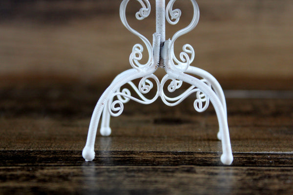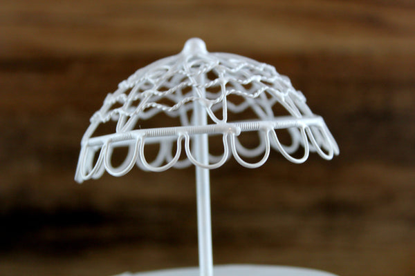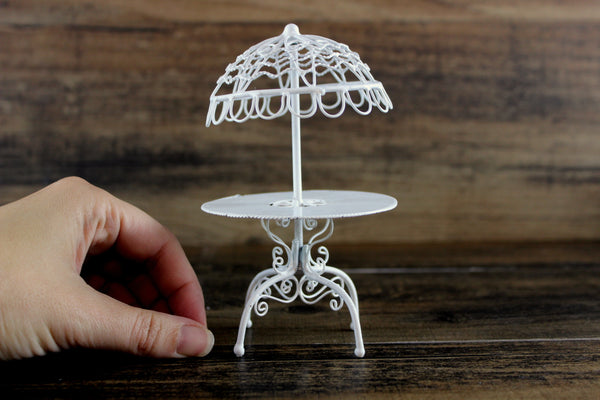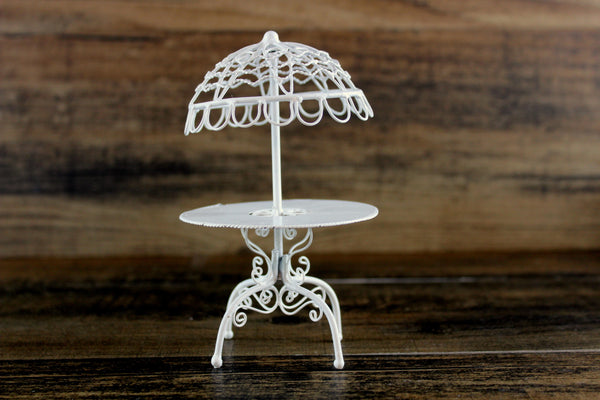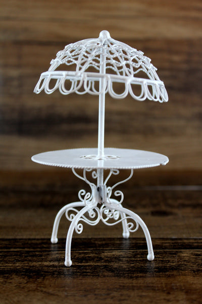 Vintage miniature 1:12 scale table is made out of white metal and has a round top with attached umbrella, pretty scrollwork and four curved legs. Part of the trim around the outside of the table has separated (please see photos), but this is can either be glued back into place or left as-is. It's in otherwise excellent vintage condition and perfect for your dollhouse porch, patio, or garden!