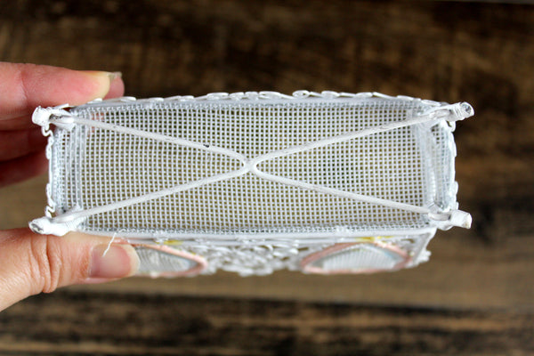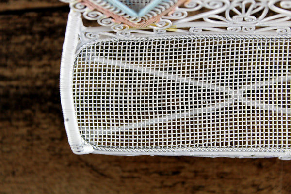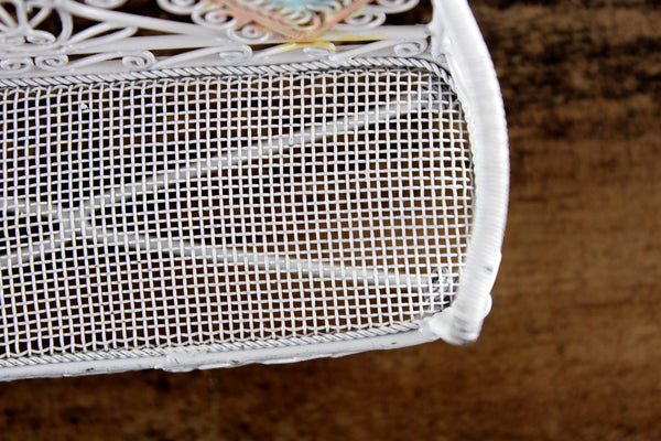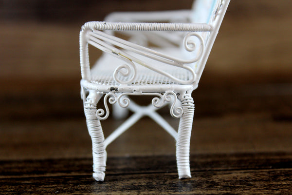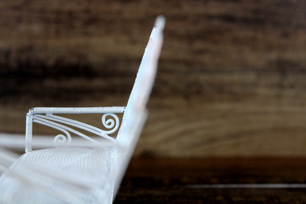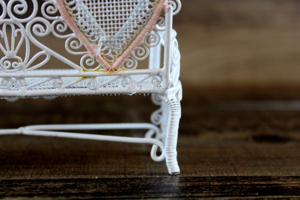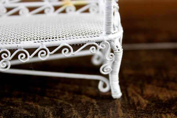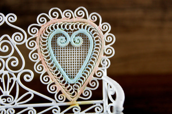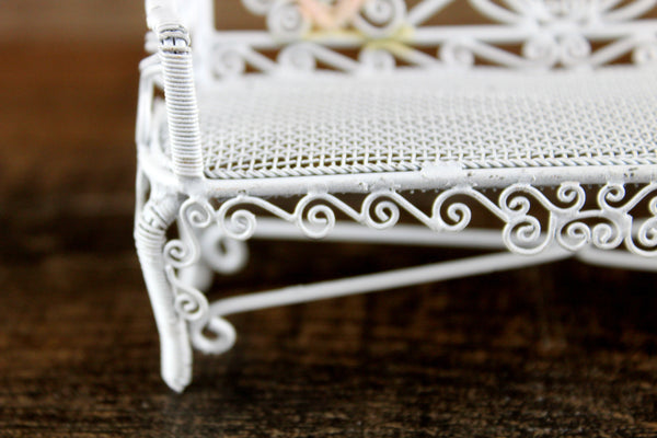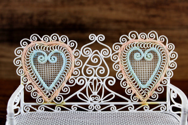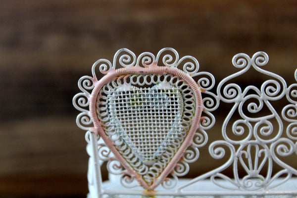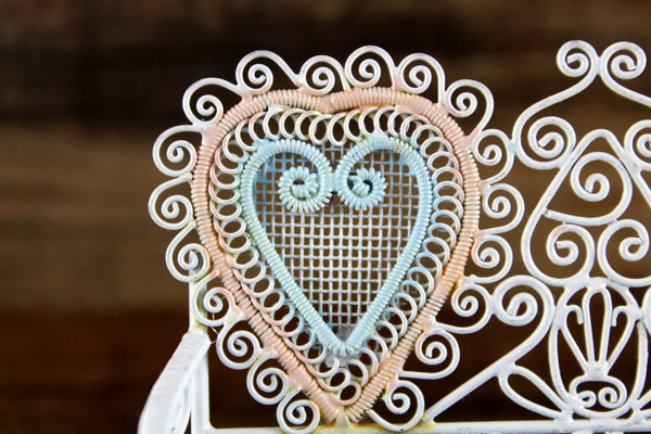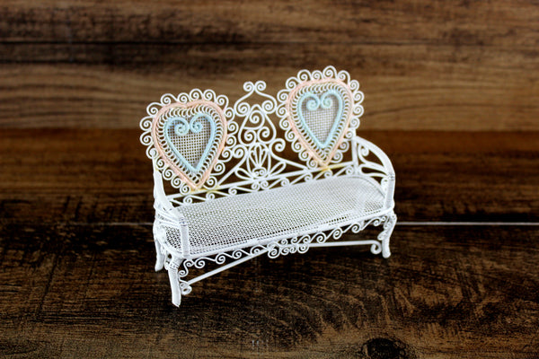 Cute vintage miniature 1:12 scale bench is made out of white metal and has a mesh seat, pretty scrollwork, and two heart-shaped designs on the back accented with pink and blue. Excellent vintage condition and perfect for your dollhouse porch, patio, sunroom, greenhouse or garden!