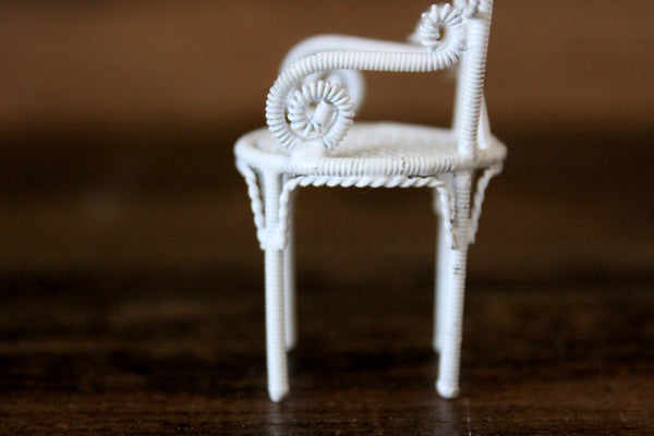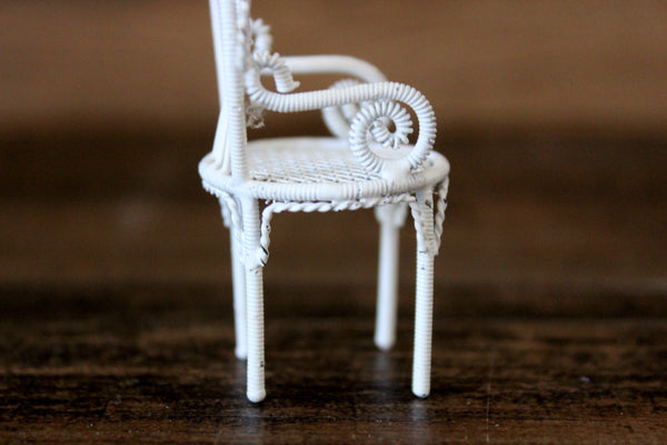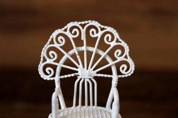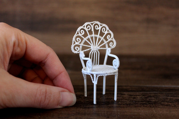 Vintage miniature 1:12 scale parlor chair or dining chair is made out of white metal and has a mesh seat, fan-shaped back, curved lines and scrolled details. Excellent vintage condition and perfect for your dollhouse parlor, dining room, kitchen, porch, patio, sunroom, or garden!