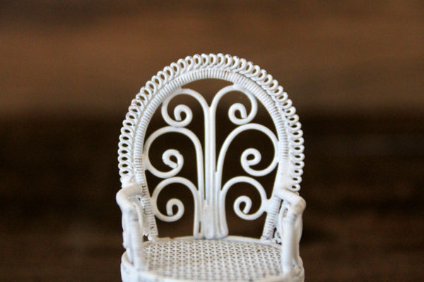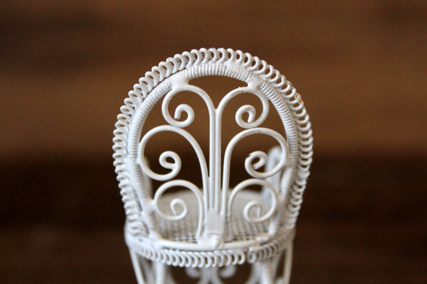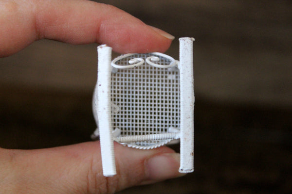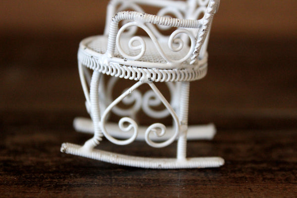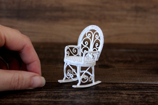 Vintage miniature 1:12 scale rocking chair is made out of white metal and has a mesh seat, curved lines and scrolled details. Excellent vintage condition and perfect for your dollhouse parlor, living room, porch, patio, sunroom, or garden!