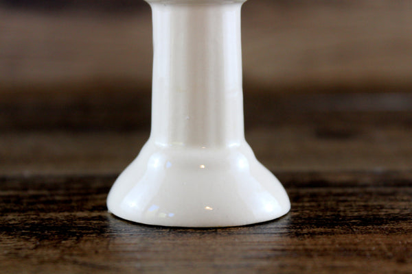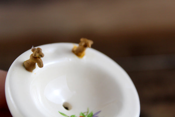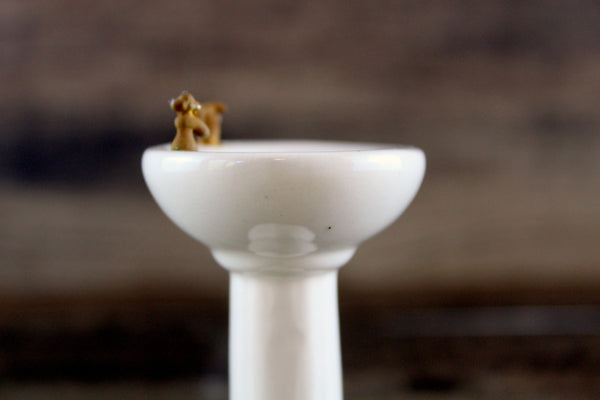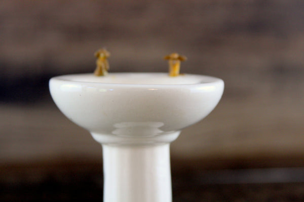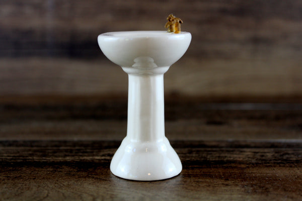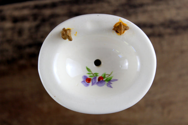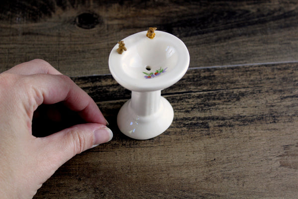 Vintage miniature 1:12 scale pedestal sink is made out of white porcelain and has a built-in soap dish and metal faucets, and there's a painted floral accent in the bowl in purple, red, and green. The faucets are rusted and one of them has the tip broken off (please see photos), but these can either be replaced or left as-is. It's in otherwise excellent vintage condition and perfect for your dollhouse bathroom!