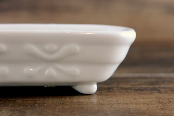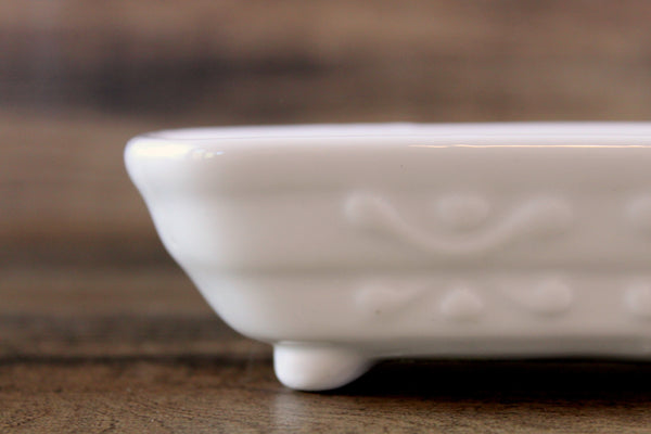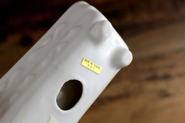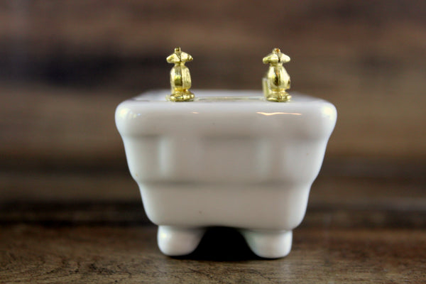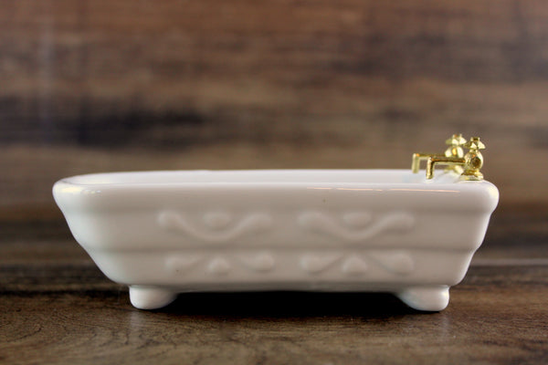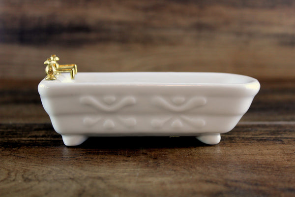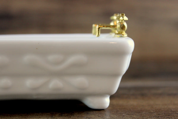 Vintage miniature 1:12 scale bathtub is made out of white porcelain and has a textured pattern on the sides and gold metal faucets. The sticker on the bottom reads "Made in Taiwan R.O.C". There is some dried glue around the base of the faucets (please see photos), but it's in otherwise excellent vintage condition and perfect for your dollhouse bathroom!