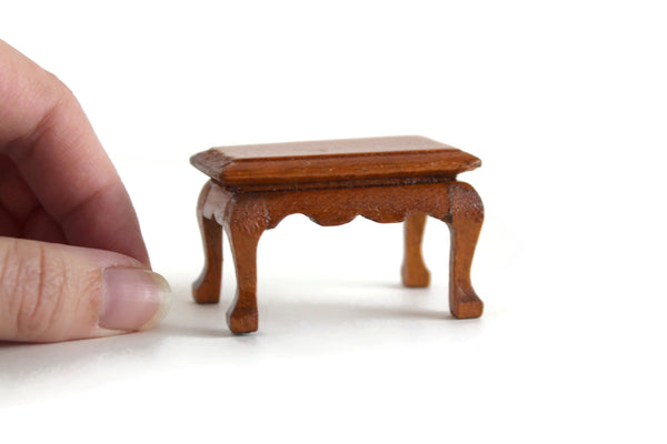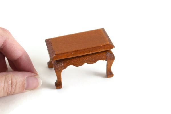 Vintage miniature 1:12 scale table is made out of wood with a medium stain and has curved lines and legs and it can be used as a coffee table, end table, or side table. Excellent vintage condition and perfect for your dollhouse living room, parlor, den, or study!