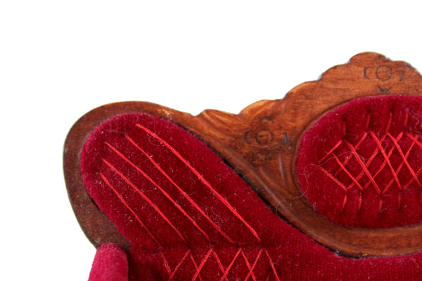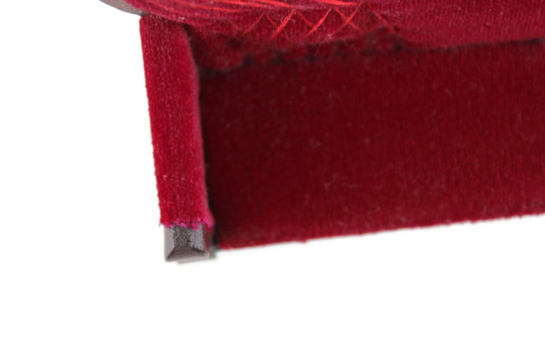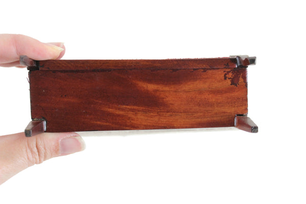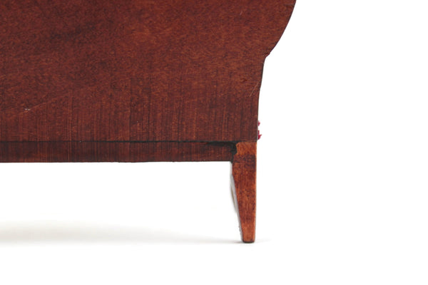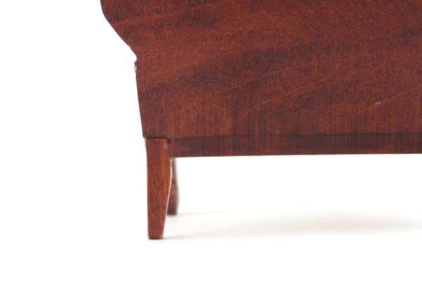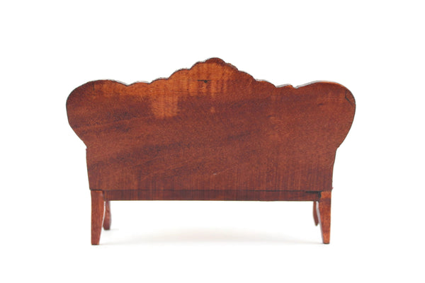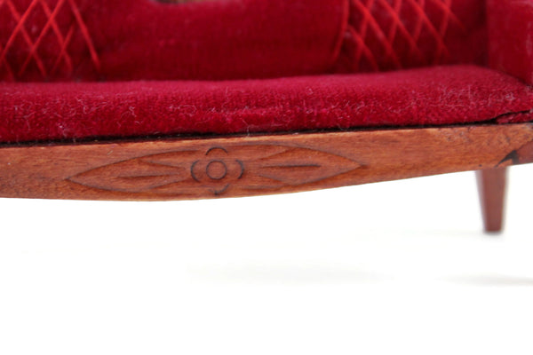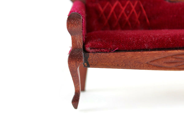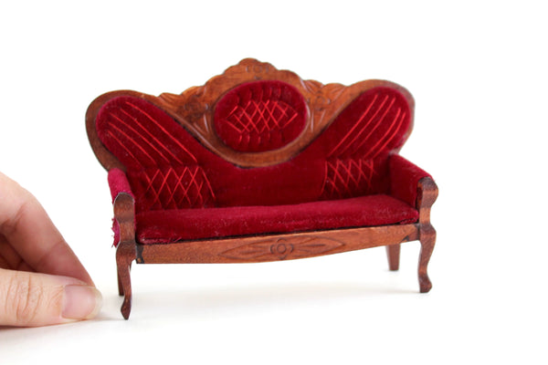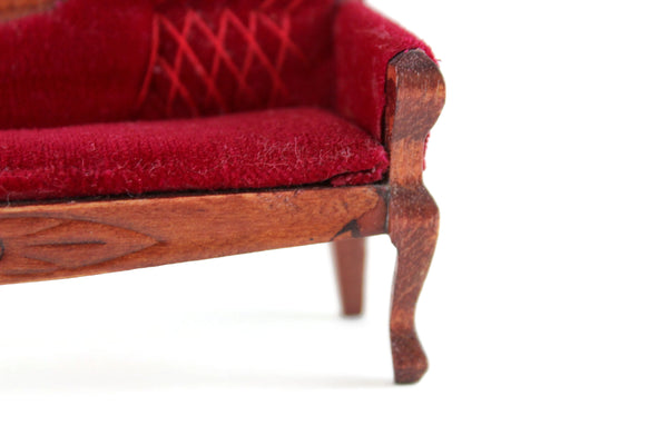 Beautiful vintage miniature 1:12 scale Victorian-style parlor sofa is made out of wood with a medium stain and has curved lines and legs, carved details, and deep red velvet on the seat cushion, armrest, and back with matching red stitching. Please note that we have 3 of these available, so the one you receive may vary slightly in pattern from the one shown in the photos. All are in excellent vintage condition and perfect for your dollhouse parlor, living room, den, or study!