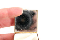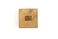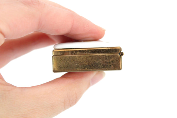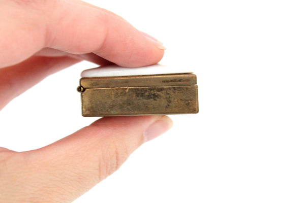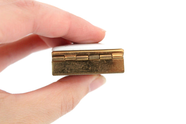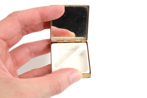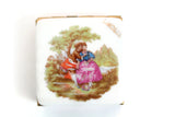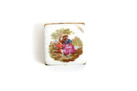 Beautiful vintage gold metal box is square with a Fragonard-style scene of a couple in a garden on a white background. "Limoges" is written in gold on the corner, and the inside has a removable white plastic liner that's divided into 2 sections. The lid is attached by a strong spring hinge. Some of the word "Limoges" has worn off a little (see photos) but it's in otherwise excellent vintage condition. The perfect little box to carry in your purse for pills, or use it for jewelry when you travel, or as a gift box.