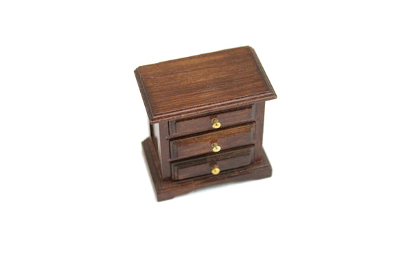 Vintage miniature nightstand or end table is made of a sturdy wood with a dark stain and three removable drawers with gold knobs. The sticker on the back reads "Made Exclusively for Concord Miniatures Made in Taiwan". Excellent condition and perfect for displaying a lamp, books, reading glasses, candlestick, or other accessories next to the bed in your dollhouse bedroom.